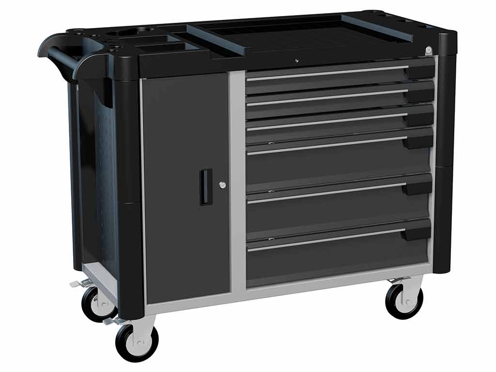 • Топ (пластик черного цвета) оснащён ложементами под инструменты для организации, хранения и удобства использования во время выполнения работ. Нагрузка на ТОП – 30 кг